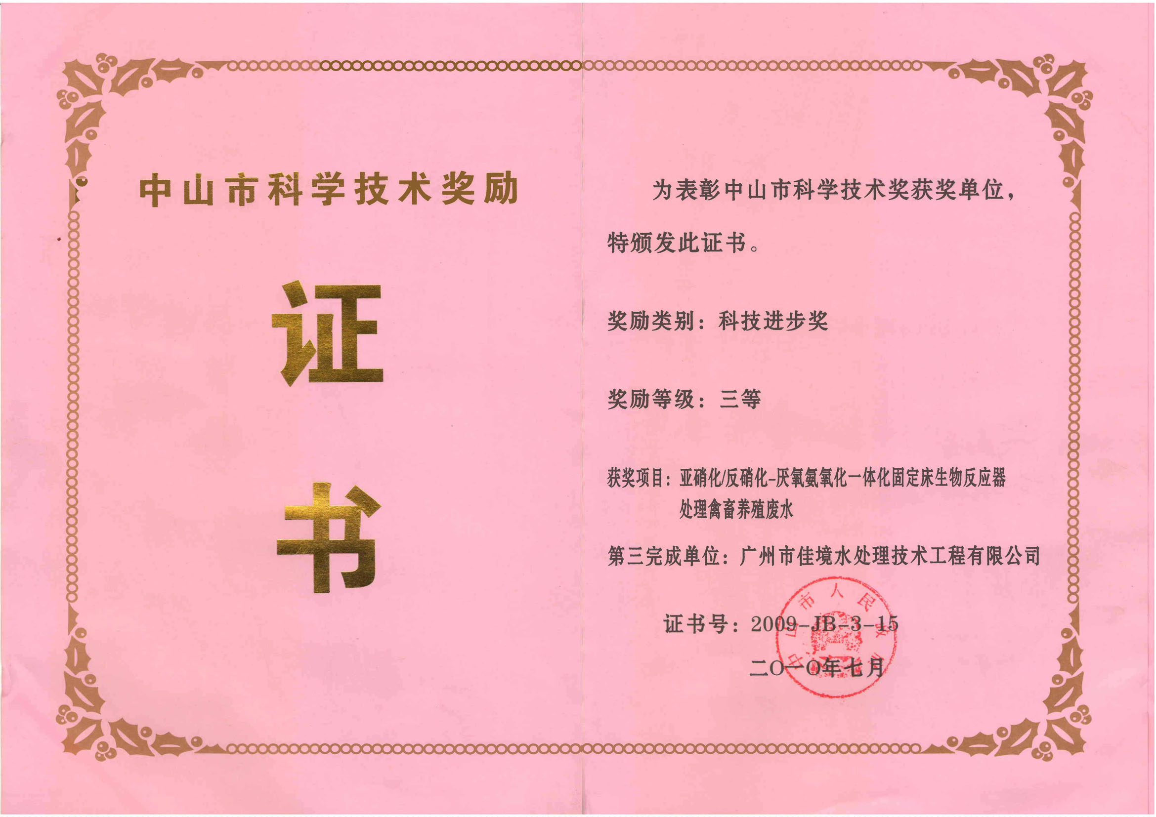 获市科技奖适用于皮革废水、养殖废水等高氨氮低碳源废水的处理。